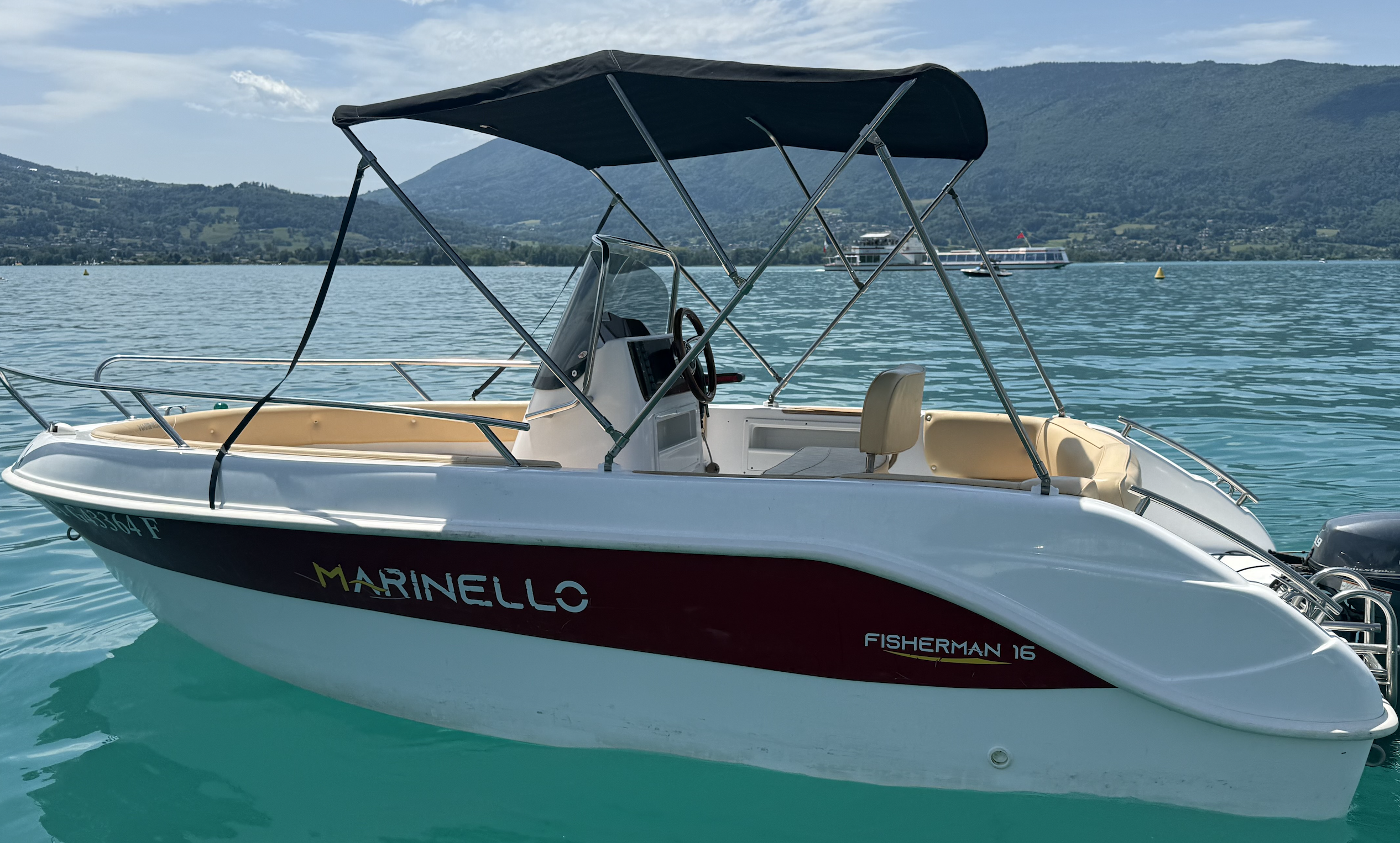 Bateau sans permis de 5m pour 4 personnes. Bain de soleil, échelle de bain, volant, taud de protection de soleil.